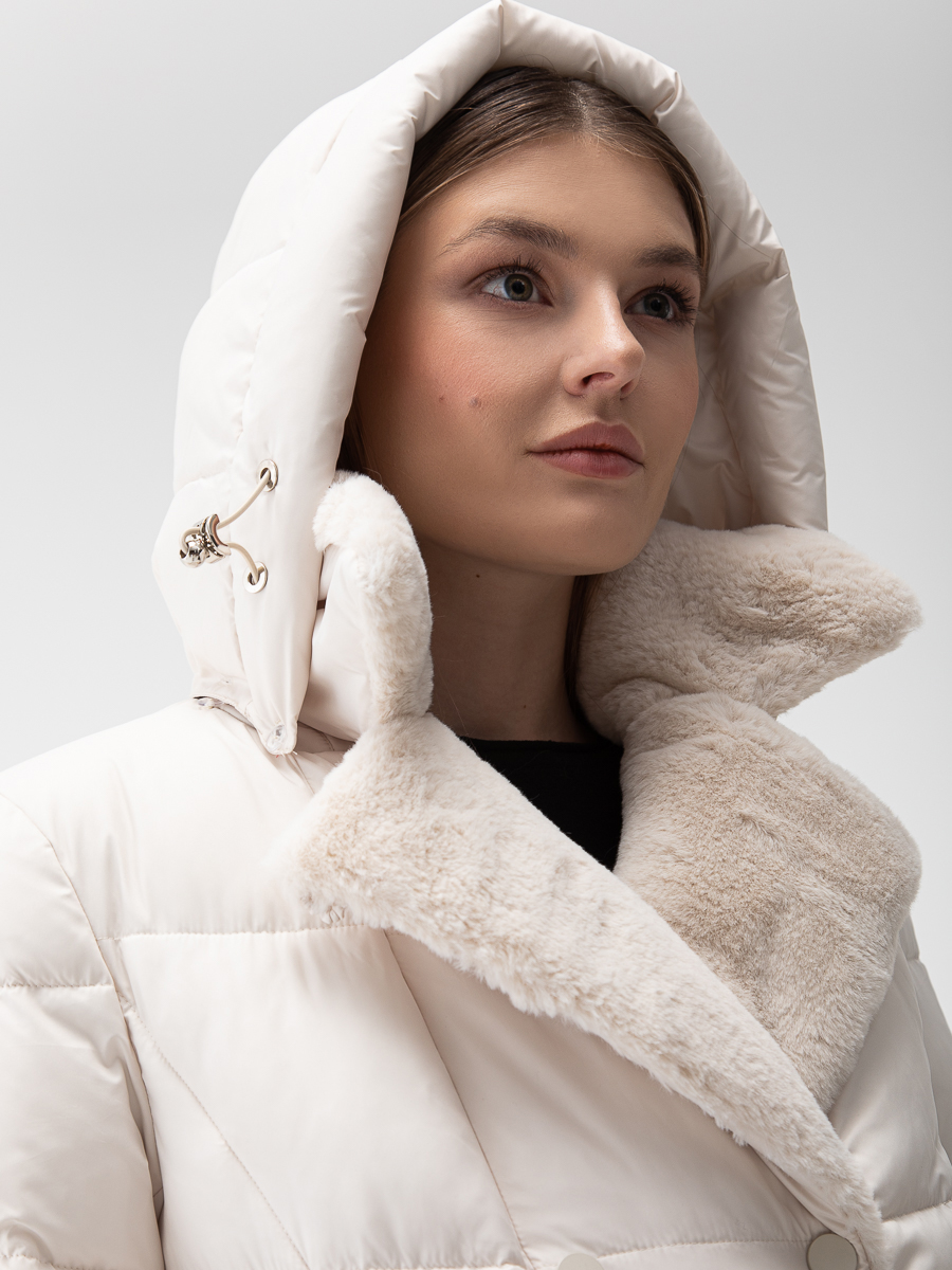 Крой воротника - съёмный капюшон, отделка эко мех